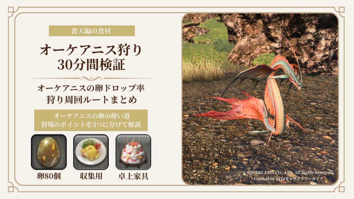 この記事では、低地ドラヴァニアにいるオーケアニスから、効率よく卵を集める為の周回ルートとドロップ率の情報をまとめています。