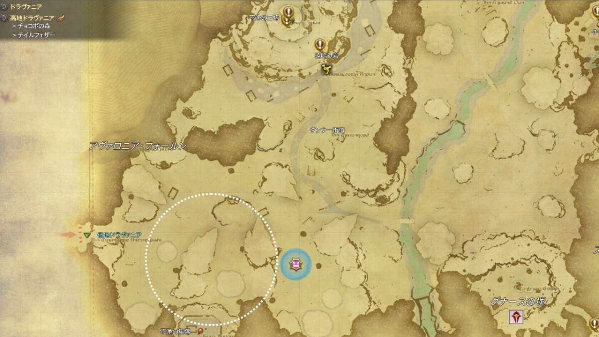 | 検証場所 | 高地ドラヴァニア アヴァロニア・フォールン付近 (X:12.0 Y:35.2) 最寄りのテレポ先 不浄の三塔 |